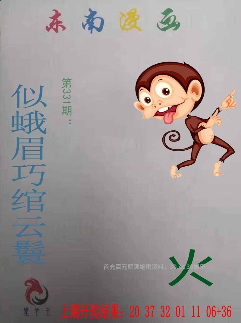 | 331期:今期生肖四五八,二三门看特有钱,木能生火可发财,将军君王美女伴。 【精解】:今期生肖四五八可解四头的特码,将军君王美女伴可解吉美的生肖。 【综合取特】:鼠蛇猴羊猪龙。 |